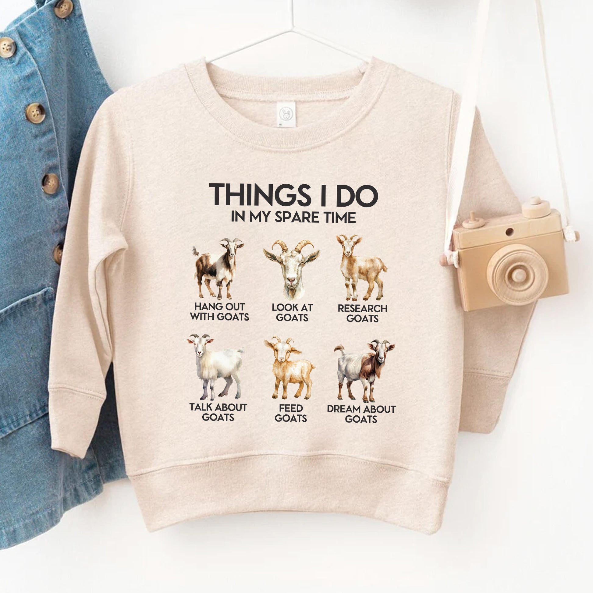 No kidding, this is the coziest top on the farm! Our "Things I Do In My Spare Time" goat sweatshirt is the perfect layer for your little explorer's next outdoor mission. Featuring six charming watercolor goat illustrations, this pullover playfully celebrates everything a young animal lover enjoys—from hanging out with the herd to dreaming about playful kids. It’s a "G.O.A.T." (Greatest Of All Time) choice for unique farm gifts for boys and girls who love the quirky spirit of country life.